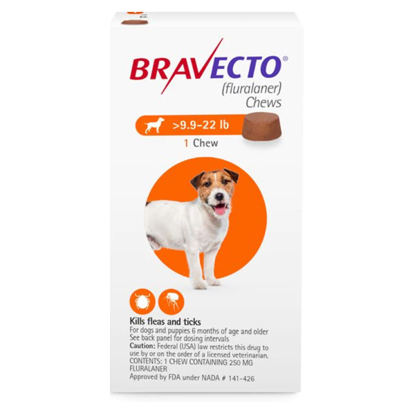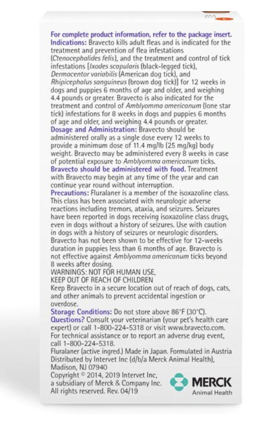 Description: Bravecto (fluralaner) kills adult fleas and is indicated for the treatment and prevention of flea infestations (Ctenocephalides felis), for the treatment and control of tick infestations [Ixodes scapularis (black-legged tick), Dermacentor variabilis (American dog tick), Rhipicephalus sanguineus (brown dog tick)] for 12 weeks in dogs and puppies 6 months of age and older, and weighing 4.4 pounds or greater.