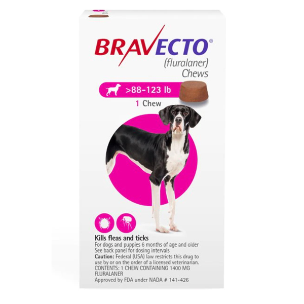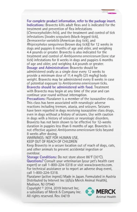 Description: Bravecto (fluralaner) kills adult fleas and is indicated for the treatment and prevention of flea infestations (Ctenocephalides felis), for the treatment and control of tick infestations [Ixodes scapularis (black-legged tick), Dermacentor variabilis (American dog tick), Rhipicephalus sanguineus (brown dog tick)] for 12 weeks in dogs and puppies 6 months of age and older, and weighing 4.4 pounds or greater.