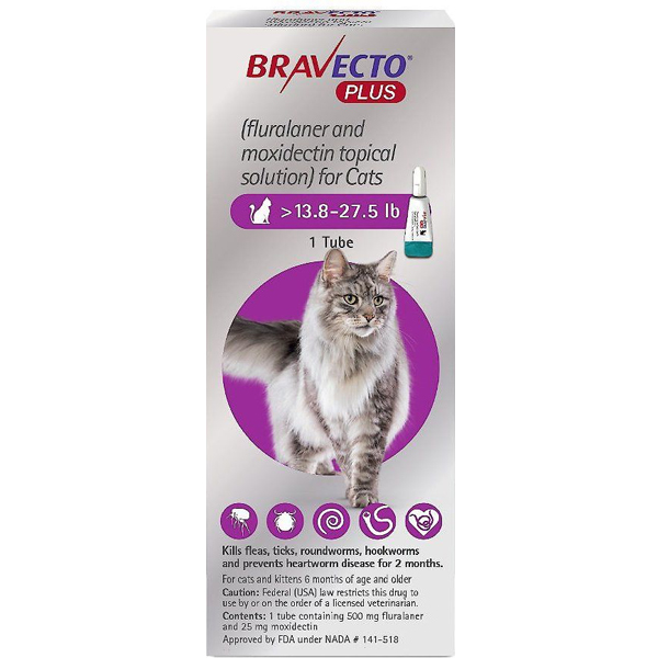 Description: Bravecto Plus is a topical solution for cats prescribed by veterinarians to help provide 2 months of protection against fleas, ticks, heartworm, and intestinal parasites. It may also help to prevent and treat flea infestations while providing broad-spectrum parasite protection for your cat. This topical medication is designed with an applicator that makes application easy for you and your feline.