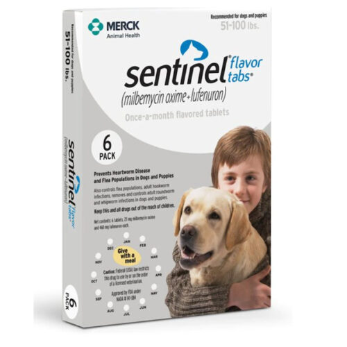 Description: Sentinel Flavor Tabs are indicated for the prevention of heartworm disease caused by Dirofilaria immitis for the prevention and control of flea populations, the control of adult Ancylostoma caninum (hookworm), and the removal and control of adult Toxocara canis and Toxascaris leonina (roundworm) and Trichuris vulpis (whipworm) infections in dogs and puppies, four weeks of age and older, and two pounds body weight or greater. See package insert for complete product details.